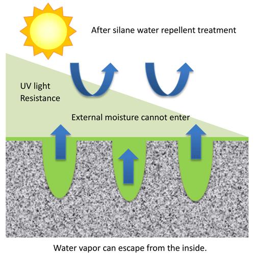 When cured, external liquid water is kept from entering the pores, while water vapor generated from within the structure can still escape. The structure remains breathable. Because they are inside the pores, water repellent treatments are not affected by UV radiation. |