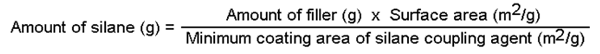 The actual values may deviate from the calculated value depending on the surface condition of the filler or the silane treating process. The following values may be used as guidelines when the value is unknown. A dilution of 1% silane to filler may be considered as standard. Generally 0.3% to 0.5% is recommended. |