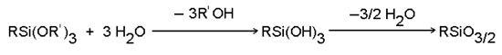 The alkoxy groups of the coupling agents react with water to form silanol groups which immediately form covalent bonds by dehydration and condensation: |